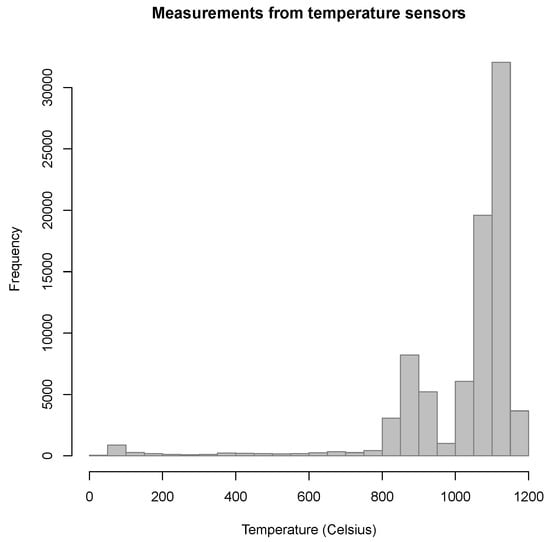 In this paper, we consider the combined data from five of the temperature sensors, yielding a data vector of length n = 82,895 as an example for the application of the Cauchy mixture model. We initially plot the distribution of the temperature measurements as displayed in Figure 10. The histogram of the data displays bimodality, with many extreme values in the left tail. Obviously, in this case, the mean of the data () is less than the median (1086) due to the skewness. The interquartile range () of these data is equal to .