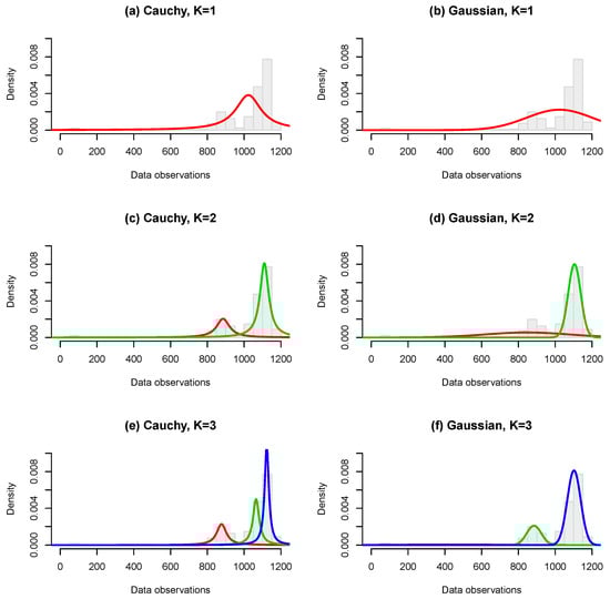 Figure 11a,c,e displays the plots of the density curves of the corresponding mixture model. The right hand side gives, for comparison, the corresponding Gaussian mixture fits. One can see from this the fundamental difference in which Cauchy and Gaussian mixtures operate: The Cauchy mixtures are always centered where relevant peaks of the data are, while some of the Gaussian components try to accommodate the outliers through an extremely flat component. The Cauchy mixtures do not need such a flat component, since their heavy tails can deal with the extreme values already. As a consequence, Cauchy mixtures will generally need fewer components than Gaussian mixtures. In addition, we see in Table 4 that, while Cauchy mixtures are superior to Gaussian mixture models for and , the Gaussian mixture model becomes superior for , in terms of both log-likelihood and BIC. It is evident from the provided graphs that densities with certainly do not need to be considered, and that the Cauchy mixture with appears to give visually the best fit.