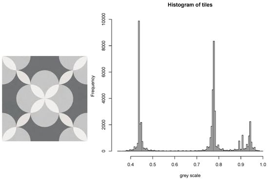 This example considers the analysis of a greyscale image of a symmetrically tiled mosaic. In Figure 12 (left), we illustrate an image which, at first glance, seems to consist mainly of three grey tones. After reading the image into the programming language R and extracting the greyscale information with appropriate tools [27,28], the distribution of greyscales over the 225 × 225 = 50,625 pixels of the image can be displayed in form of a histogram, as in Figure 12 (right). We see that, despite our original impression that there are only three shades of grey present in the mosaic, it is in fact not so clear cut: while there appear to be three major clusters, all of them come with some spread, which is very small for the first two clusters (corresponding to the darker shades), but a bit larger for the third cluster, corresponding to the whitish scales. In fact, one could argue that this last cluster consists of two or more sub-clusters. Furthermore, it appears that there are pixels of outlying grey shade all along the scale; even in the center region where the grey scale is about 0.6 they do not entirely disappear.