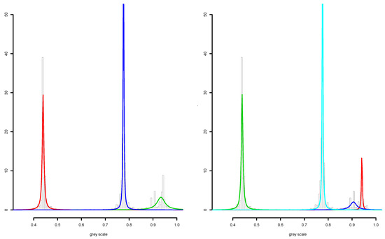Motivated by the considerations above, we proceed with fitting the Cauchy mixture model with and components. We see in Figure 13 that in all cases the peaks are clearly identified, with in the latter case, the “white’ cluster being split into a sharper peak, which captures the actual shading of this class, plus a wider one, which captures contaminations or impurities of the original white color. The robustness to outliers of these fitted components is evident from the fitted mixtures. Summarizing, the Cauchy mixture model has done a useful job at identifying the original “true” grey shades of the mosaic.