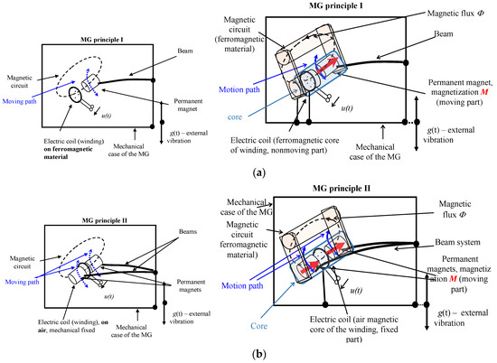 The principal configuration of the core of the milli- or micro generator (MG): (a) a beam version, principle I; (b) a beam version, principle II [2].