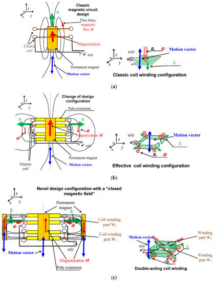 As regards the microgenerator design (Figure 1), Figure 2a introduces the most widely preferred principle (I, [2,3]); in the given context, it is necessary to respect the general conclusions of Faraday’s law of induction as formulated in, for example, Equation (1) and Figure 2b below. Figure 2 shows multiple processes and elements, including the magnetization of the permanent magnet M; magnetic flux Φ; magnetic lines of force; oriented area S enclosed by the coil thread; electric coil; and, character of the generator’s core motion with respect to the coil. The related Figure 2c then introduces a design version that minimizes the impact of external electromagnetic fields (non-stationary) on the principal function of the generator.