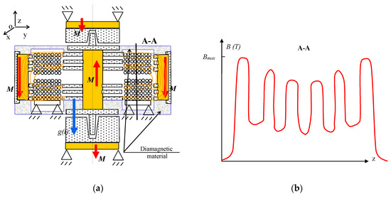 The basic arrangement of the investigated device exploiting Faraday´s induction law: (a) the MG core; and (b) the magnetic flux density distribution along the z axis, line A-A.