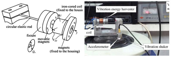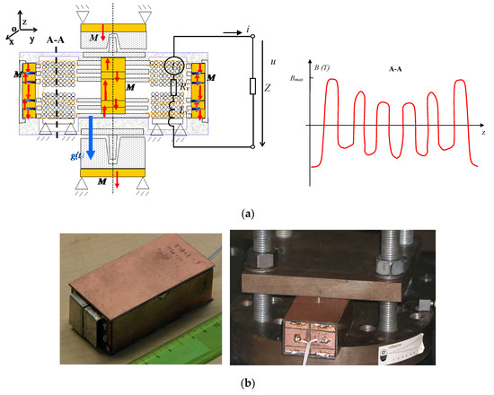 In recent years, alternative sources of energy have become the main subject of numerous research projects [1,2,3,4,5,6,7,8,9,10,11,12,13,14,15,16,17,18,19,20,21,22], with the optimum energy conversion being one of the central points of focus. Such a transformation is often ensured through a vibration microgenerator [23,24,25,26]. Effective energy harvesters exploiting the mechanical vibrations and related non-stationary magnetic fields have already been investigated and reported [2].
