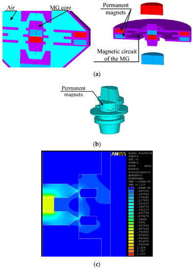 A geometrical rotationally SYMMETRIC model of the MG0 based on principle II [2]: (a) the ANSYS geometrical model; (b) the core; and, (c) the optimal design, detailed distribution of the magnetic flux density module B [T].