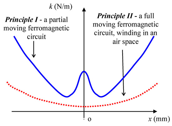 The applied stiffness characteristics [2], coefficient k; the behavior is nonlinear in both of the MG magnetic circuit principles.