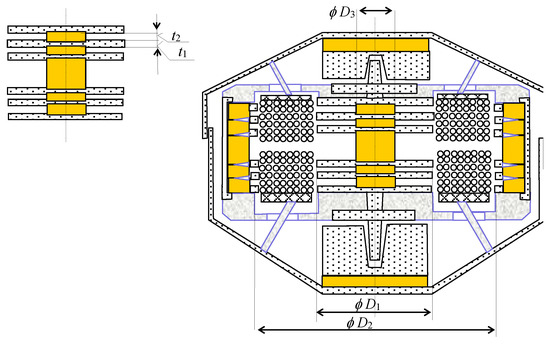 Such an approach to the mechanical configuration of the MG is suitable for multiple purposes in microtechnology, including the formation of fields of resonant MGs (Figure 9, Figure 10, Figure 11 and Figure 12). Two approaches were tested as regards the electromagnetic field: one utilizing air to substitute for the ferromagnetic material in the magnetic field (principle II, Figure 1b), and the other applying a ferromagnetic material according to Figure 3a. Figure 9 demonstrates a solution to facilitate the further development of the progressive concept (principle II) through changes of the dimensional parameters of the design, t1, t2, ϕD1 − ϕD3.