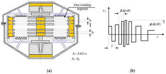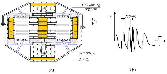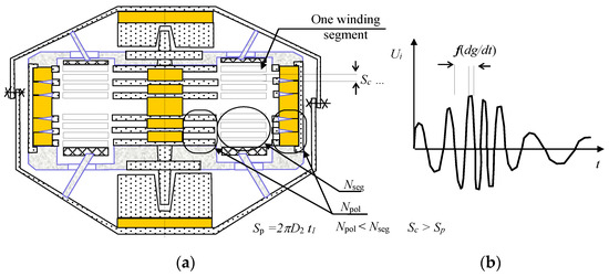 In order to apply the above-defined principles and conclusions, we have to consider the relevant figures (MG principle II, Figure 1b, Figure 3a and Figure 9, Figure 10, Figure 11 and Figure 12, where Sc is the effective area of the coil, Figure 2c; Sp denotes the area of the pole extension; t1 represents the thickness of the pole extension of the MG core; Nseg is the number of the electrical winding segments; Npol is the number of the pole extensions of the core and shell; and, f (dg/dt), g (dg/dt) denote the time variation of the gravitational acceleration of the moving part of the microgenerator. The correct setting of the MG0 structure, Figure 9, Figure 10 and Figure 11, can be verified through measuring or evaluating the behavior of the output voltage on the terminals of the MG segment. The obtained instantaneous values of the patterns of the voltage u(t) are then applicable in expressing, via the indirect method and based on the above formula (5), the observed physical quantities of the model.