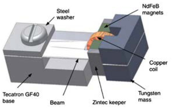 Figure 3, as above, presents one of the progressive options available for seating the moving part of the generator, a solution that eliminates the classic spring or girded beam (Figure 1). The designed system (Figure 3), is tuned to the mechanical oscillation resonance frequency fres and it constitutes the basis of the optimal approach. Such an arrangement allows for us to reach the maximum possible harvest rate and transform the field into an electric voltage; Figure 4 shows the corresponding preconditions.