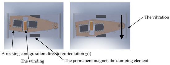 The microgenerator utilizes an external environment that is characterized by the occurrence of mechanical vibrations, exploiting a suitable mechanical coupling to dampen these vibrations and generate an electric power Pout. The required output power Pout of the optimal design depends on the type of the output load Z. The optimal arrangement of the MG is based on the concepts in Figure 1, Figure 2c, and Figure 3, with the magnetization orientation indicated. In terms of the mechanical properties, the device was discussed in dedicated papers and patents, such as [10,25]. Figure 4 presents details of the transformation process and electricity generation; the actual engineering approach adopted in solving these procedures then embodies the necessary precondition for the subsequent identification of the optimal design. The mathematical model outlined in [2] is, in a basic form, incorporated in the corresponding Formula (5), below.
