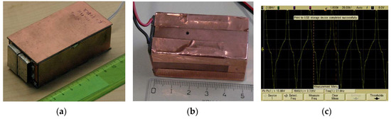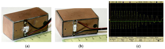 The tested microgenerator [2] based on Principle I: (a) MG I—the dimensions of 90 × 40 × 30 mm, Uout max = 300 V; (b) MG II—the dimensions of 50 × 27 × 25 mm, Uout max = 20 V; and (c) the instantaneous behavior of the output electrical voltage in MG I and MG II (the effect of the stiffness coefficient k—Figure 8).