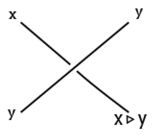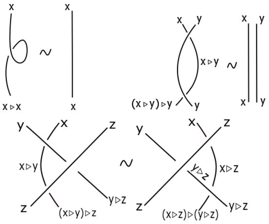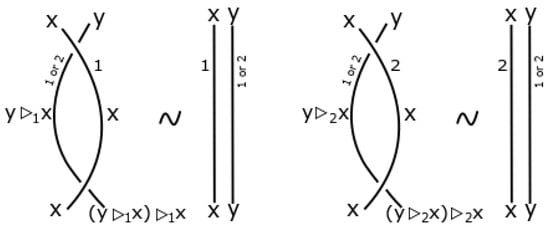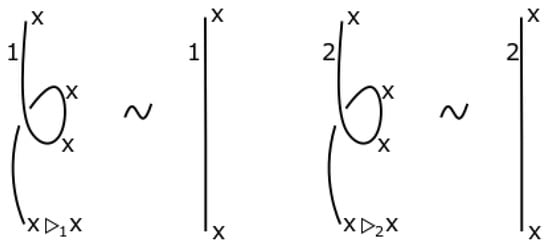 In [], most of the basic concepts and terminology on quandles can be found. This section begins with the definition of an involutory quandle (or a kei), and we show how the axioms of a kei are induced by the three Reidemeister moves. In Figure 1, each “color” corresponds to an arc in a diagram, and the operation corresponds to the transformation that, when an arc x passes under another arc y, we get . So, when x crosses under y, is a new arc, but y is unchanged; y is doing something to x. See [] for reference.