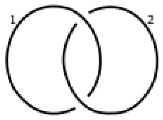 A dichromatic link in is the image of a smooth immersion of a finite number of circles in that have two colors, where the two colors are usually represented by the labels “1” and “2”. For example, see Figure 3.