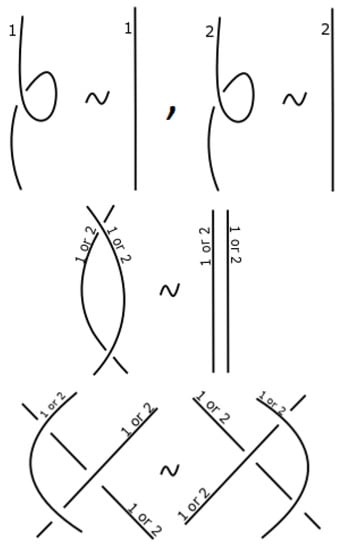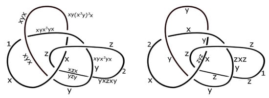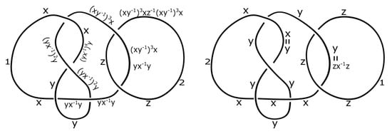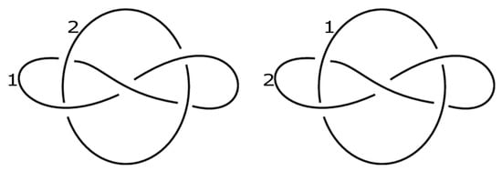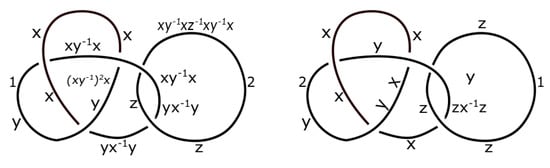 Consider the following two dichromatic links. Let G be a group with the operations and . See Figure 10 for reference, where the numbers 1 and 2 represent the colors of the components in the dichromatic links.