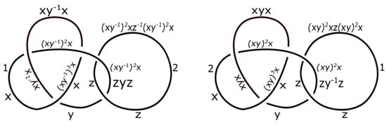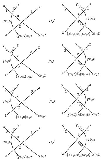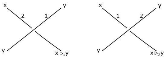 In Figure 10, the right-hand image (B) shows the relations at the crossings resulting from the binary operations, which give , , and . Thus, the set of coloring is