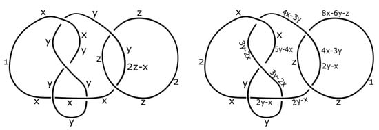 In Figure 11, the right-hand image (B) show the relations at the crossings resulting from the binary operations give , , and . Thus, the set of coloring is