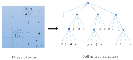 The coding unit (CU) is a square area that is used to represent the leaf nodes of the CTU. It shares the same prediction mode: Intra, inter, and skip. The quad-tree partition structure of the CU allows the parent node to be recursively split into four child nodes of the same size. The size of each CU is from the CTU to 8 × 8 adaptive selection. In the CTU, the split flag (split_cu_flag) is used to indicate whether the current CU block will continue to split into four sub-CUs. When the flag is one yes, the CU splits; for each generated CU block, another flag is transmitted and indicates whether the current block represents one CU or will be further divided into four CU blocks. When the size of the CU block is 8 × 8, no split flag is transmitted during the encoding process. Therefore, the computational complexity of the CU partitioning process is very high. In general, a low complexity encoder will try to choose a larger CU size instead of a small CU size.