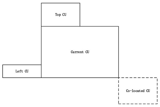 Moreover, the video sequence has a strong spatial and temporal correlation. The context adaptation of context-adaptive binary arithmetic coding (CABAC) fully exploits the context correlation and models the coded symbols. The CU partition depth information is also a very effective feature. Figure 4 shows the neighboring CUs of the current CU; depth information of neighboring CUs is useful for CU size decision. In this work, , , and represent the depth information of top, left, and co-located CUs of the current CU. Therefore, the feature set w is used to make CU size decision, which consists of