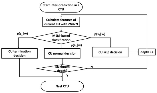 Secondly, the authors of [17] propose an efficient block partitioning approach for H.265/HEVC by using Bayesian theory. In this context, Gaussian mixture models are used to estimate statistical parameters. The work in [18] presents a support vector machine (SVM)-based CU size decision algorithm, and a radial basis function (RBF) kernel is used to optimize variables. In [19], a neural-networks-based CU depth decision method is proposed to reduce the complexity of the H.265/HEVC encoder. In this context, a database is developed, which includes image values and encoding information. Moreover, a neural network architecture is designed to train model parameters. In [20], CU size decision is modeled as a Markov decision process (MDP), and the end-to-end actor critic (AC) algorithm is used to train the model. The authors of [21] present a Bayesian-classifier-enabled CU size decision algorithm, and the Markov Chain Monte Carlo (MCMC) technology is used to estimate statistical parameters. The advantage of the classification-model-based method is that the algorithm is simple, and the disadvantage is that the robustness is not high.