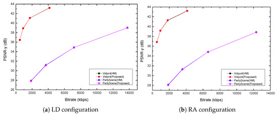 Rate–distortion (RD) curve of the proposed algorithm for sequences Vidyo4 and PartyScene.