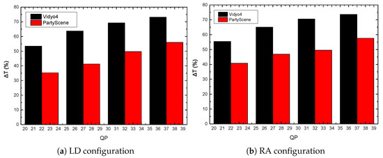 Figure 7 shows the rate–distortion curve comparison between the proposed algorithm and the reference method under LD and RA configurations for the typical Vidyo4 and PartyScene sequences. As shown in the figure, no matter in the high bitrate interval or in the low bitrate interval, the proposed method can achieve almost the same rate–distortion curves as those of the reference model. Furthermore, the time savings under different QPs and configurations for Vidyo4 and PartyScene sequences are shown in Figure 8. It is seen that when the QP value is 37, the average time saving is highest. As the value of QP decreases, the average time saving decreases. In summary, the proposed method can significantly reduce the computational complexity under the LD and RA configurations.
