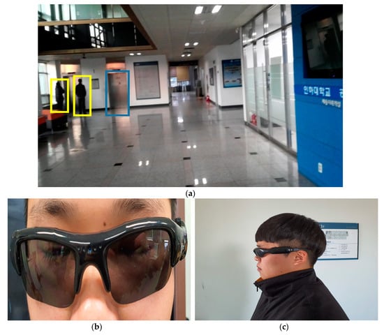 Visually impaired person searching for an elevator. (a) The university lobby where a blind person is searching for an elevator. The possible obstacles are the sofa and two people in front of the elevator. (b) Smart eyeglasses that capture the input image through a camera. (c) Person receives direction information through the eyeglass speaker.