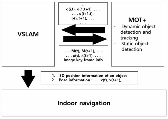 Figure 2 shows the block diagram of the proposed system where VSLAM and motion person tracking (MPT) play a significant role for obstacle removal in a dynamic environment. Here, VSLAM receives a visual measurement (Z) and a motion measurement (U) to determine a map (M) and a pose (X). In the next step, the MPT receives the time measurement (Z) and outputs the position (P) of the moving person and the motion mode (S). Finally, VSLAM determines M and x composed of the static landmark by taking Z and U without assuming that the surrounding environment is static. Then, it outputs the dynamic object position (O) and (S).