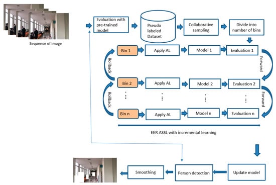We can see from Figure 4 that person detection was applied to find out whether a human exists in the scenario or not, since labeling images for classification is expensive, but unlabeled data carry almost no information related to human-action recognition. Therefore, in order to improve person-detection accuracy, we required a semisupervised-learning (SSL) algorithm [14]. From a large volume of samples, we can find a way to gather informative samples that can contribute to EER–ASSL performance. Sampling bias or wrongly labeled samples can hamper detection performance. Therefore, AL helps our proposed system overcome wrongly labeled samples by relabeling. Moreover, expected-error-reduction sampling becomes handy.