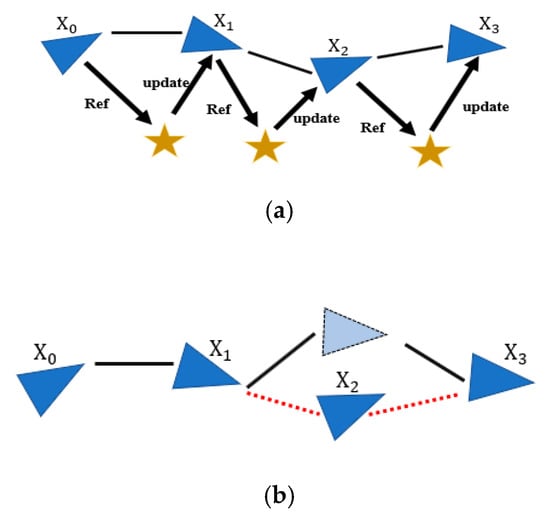 We selected SLAMMPT, which uses the feature-matching assessment method. In the issue of data association, it is about combining present characteristics (landmarks) with earlier observed characteristics to acknowledge past landmarks or locations. The presence of moving obstacles improves the likelihood of short- and long-term-information association-error accumulation [13]. Figure 5 indicates the strong lines in which a robot poses. Star marks represent landmarks or feature landmarks. Figure 5a demonstrates how landmarks make the robot pose. Robot poses X0, X1, X2, and X3 are disordered by a moving person [15]. Figure 5b shows that the camera pose in key frame X2 is pointing in the wrong direction. The correct camera pose is in the triangle with the solid line. The miscalculated camera pose and position are shown in the dotted line in light blue.
