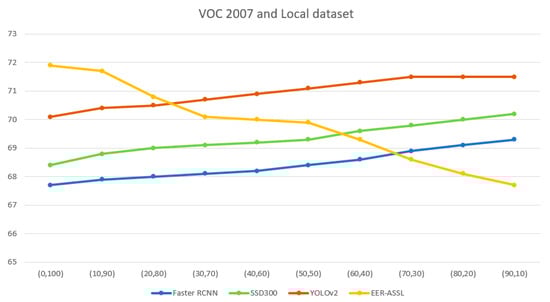 Our proposed EER–ASSL-based person detector showed improvement when compared with popular object detectors like Faster RCNN, SSD300, and YOLOv2. Since EER–ASSL was jointly trained on PASCAL VOC and the local dataset after the network was fine-tuned, fast adaptive capacity was achieved regardless of velocity. Our EER–ASSL technique, as shown in Table 2, considerably increased the detection efficiency of the local dataset and its environment. For fair evaluation, each of the four objects had 100 labeled and 300 unlabeled samples. The detectors were trained for reasonable assessment by using the same benchmark dataset and local dataset. Table 2 demonstrates the comparison outcomes, where each column shows both the benchmark and local information composition percentage.