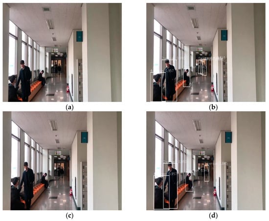 Original image sequence of the local dataset and detected person. (a) Original image sequence. (b) Detected person in image sequence. (c) Original image sequence. (d) Detected person in image sequence.