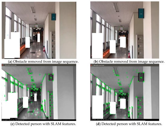 (a,b) Local dataset with removed obstacle. (c,d) Image sequence with feature extraction in a SLAM system where uncertainty instance was successfully filtered out.