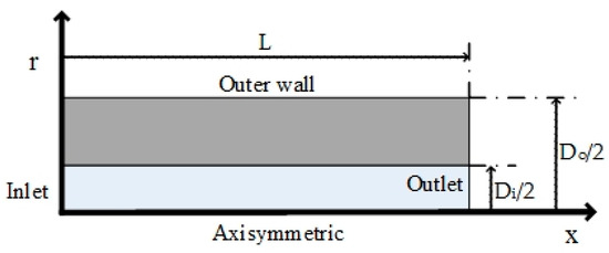 Numerical models are applicable for modeling the flow of fluid and heat transfer of complex geometries and operating conditions [48,49,50,51]. In the first step of the present modeling procedure, it is required to define the geometry of the microchannel. The geometry of the investigated problem in the current research is shown in Figure 1. An axisymmetric microchannel with inner diameter of Di = 0.1 mm and outer diameter of Do = 0.3 mm with L = 100 mm length and a constant heat flux applied on the outer wall qo = 5305.3 W m−2 is studied. The wall thermal conductivity is equal to that of the steel, k = 16.3 W m−1 K−1. It is considered that, at the microchannel inlet, the temperature and velocity are uniform. Heat flux in uniform condition is applied on the outer wall and the condition adopted at the outlet is fully developed. At the interface of solid and liquid, conjugate heat transfer procedure is considered and the continuity of heat flux and temperature are defined at the interface.