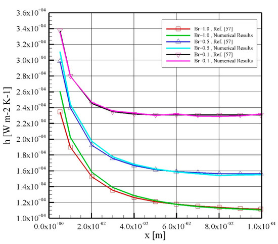 In order to investigate mesh independency, three different grids of 45,000, 70,000, and 87,500 are used. As the flow is axisymmetric, only the flow in a single plane from the centerline to the microchannel’s wall is required to be solved. In fact, only a half portion of the axisymmetric microchannel is considered and the domain is revolved through its axis. Therefore, the 3D problem is reduced to a 2D problem, leading to less computational grid and consequently less computational cost. Structured mesh with fine mesh adjacent to the walls was used. The convective heat transfer coefficient is obtained for these grids. The maximum deviation for convective heat transfer in grid 2 and grid 3 is less than 0.01%. Therefore, the second grid was used for further investigations. To validate the numerical code, the results of the work of [57] are compared with those of the present study. Figure 2 shows the comparison for different Brinkman numbers. Acceptable agreement is observed between the results of this study with the work of [57]. A maximum error of 6.1% can be seen at the entrance region for Br = 1.0. As can be seen from Figure 2, increasing the Br number—and consequently the inlet mean velocity of the nanofluid—leads to a reduction of convective heat transfer coefficient which is in contrast with the behavior of the fluid in macro-scale channels.