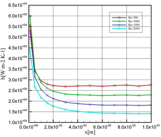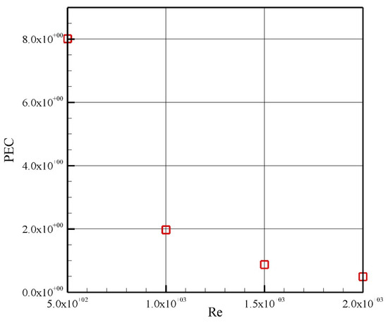 In Figure 3 and Figure 4, heat transfer coefficient as well as PEC is depicted for a constant nanoparticle concentration of 2% and an average diameter of 10 nm, respectively. It can be observed that, as the Reynolds number increases, the coefficient of convective heat transfer decreases. This is in contrast with the macro-scale heat transfer problem. In microchannels, an increase in inlet velocity leads to more viscous dissipation rates. As the friction between the wall and fluid is high in microchannels, the temperature of the wall grows more intensely compared with the bulk temperature of the fluid. Therefore, the temperature difference between the bulk of fluid and the wall increases, which leads to decrement of convective heat transfer coefficients for higher Reynolds numbers. The same pattern is observed in the investigation by Lelea and Nisulescu [57], where a higher Br number leads to a lower convective heat transfer coefficient. From Figure 4, it is obvious that an increment in Reynolds number leads to a decrement in performance of the system. PEC is 8.01 for Re = 500 and reduces to 0.50 for Re = 2000. This is attributed to high pumping powers required for higher pressure losses in cases with great values of Reynolds numbers. Increased heat transfer has always been at the expense of increased pressure losses. Therefore, a compromise between these two parameters is needed.