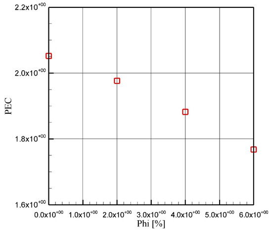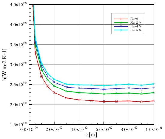 In Figure 5 and Figure 6, the heat transfer coefficient as well as PEC is shown for a constant nanoparticle diameter of 10 nm and constant Reynolds number of 1000. It can be seen that, as the volume fraction of the nanoparticle increases, the convective heat transfer coefficient increases as well [29,57,58]. Along the tube, for pure water, h oscillates around a constant amount of 21,000 W/m2 K, while in nanofluid with 6% of Al2O3, this is about 25,000 W/m2 K, which is an increase of 19%. The augmentation in the coefficient of heat transfer is the result of increased thermal conductivity of the nanofluid. In Figure 6, it can be concluded that PEC decreases with an augmentation in the solid phase volume fraction. This is the result of greater pressure losses, which is related to the nanoparticles. However, this decrement is not severe. More specifically, PEC is 2.05 for pure water and reduces to 1.77 for a volume fraction of 6%.