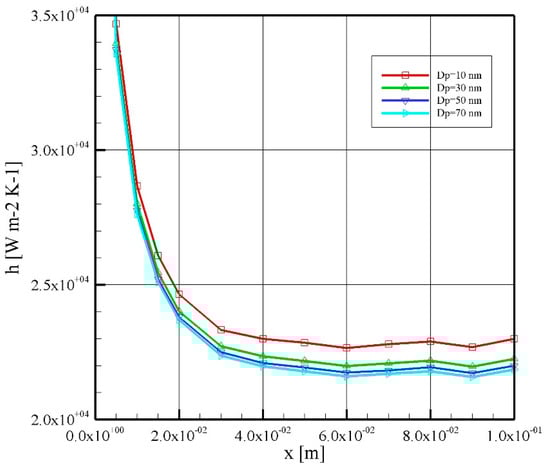 Heat transfer coefficient for the particles with an average diameter of 10 nm and Re of 1000.