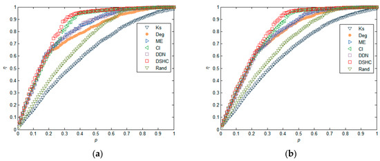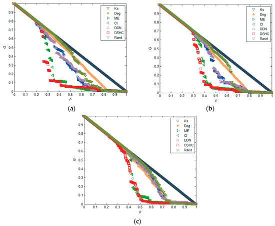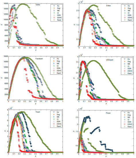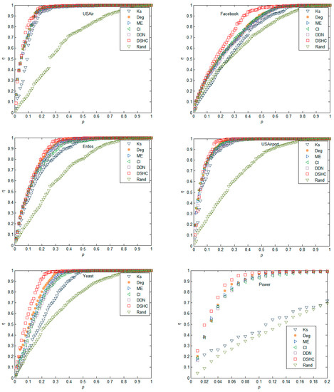 The experimental results in Figure 2 reflect the performance of different attack strategies on six real networks in terms of the maximum connectivity coefficient, which is estimated by numerical simulation of the change of relative size of the giant component of the network, as mentioned previously. It can be seen that in all six networks, using DSHC indicators to remove important nodes in the network, can make the scale of the network giant change the fastest. This indicates that the proposed DSHC index can identify the most important nodes more accurately in the network than the k-shell, degree, ME, CI, DDN, and Rand. For example, in the Yeast network in Figure 2, when p = 0.2, the G values of the k-shell, degree, ME, CI, DDN, DSHC, and Rand are 0.7154, 0.5314, 0.5903, 0.5781, 0.6143, 0.2080, and 0.7229, respectively, which indicates that the network connectivity becomes worst as compared with the k-shell, degree, ME, CI, DDN, and Rand when using the DSHC method to remove the top 20% nodes. The attack effectiveness of DSHC is 70.92%, 71.23% higher than that of k-shell and Rand respectively. Similarly, in power network, when p = 0.1, the G values of the indicators k-shell, degree, ME, CI, DDN, DSHC, and Rand are 0.7891, 0.1358, 0.2374, 0.3111, 0.3036, 0.0498, and 0.8197, respectively. This shows that when the top 10% of nodes are removed according to the DSHC index, the network connectivity is also the worst as compared with the top 10% of nodes removed according to the k-shell, degree, ME, CI, DDN, and Rand algorithms.