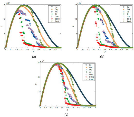 Comparison of the susceptibility (S) under different attack strategies in synthetic small-world networks, where the size of networks N = 1000, the number of neighbor nodes of each node in the nearest-neighbor coupled network is α = 8, and the randomization reconnection probabilities μ = 0.06, 0.08, and 0.1 for (a), (b), (c), respectively.