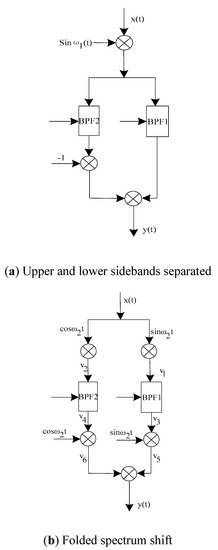 In Figure 2a, double-sideband modulation is used, and the upper and lower sidebands are separated by two bandpass filters (BPF).Then the lower sideband is inverted, and finally the upper sideband is superimposed into the system shown in Figure 2b. In Figure 2b, a pair of orthogonal pre-carriers causes the lower sideband to fold, while the upper sideband is not affected by low-pass filter (LPF) suppression. A pair of orthogonal carriers are used to move the folded spectrum to the ideal position [14], and then two signals are added or subtracted to complete the modulation process. The demodulation process is the reverse of the above process.
