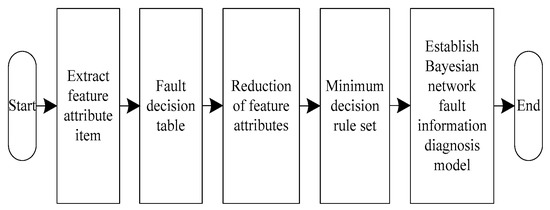 There are many system attributes and fault types in the information system based on the inverse symmetry algorithm. Therefore, the advantages of Bayesian network and rough set are integrated. Removing redundant attributes in the system through rough sets. On this basis, the Bayesian network model with the minimum diagnosis set is obtained by combining the prior knowledge in the operation of the information system [15,16]. The input of the network is the condition attribute of the decision table, and the output is the decision attribute of decision table. Through the above operations, the optimal fault diagnosis rules are established, so as to improve the efficiency and accuracy of diagnosis. The detailed algorithm steps of realizing communication fault diagnosis of information system are shown in Figure 3.