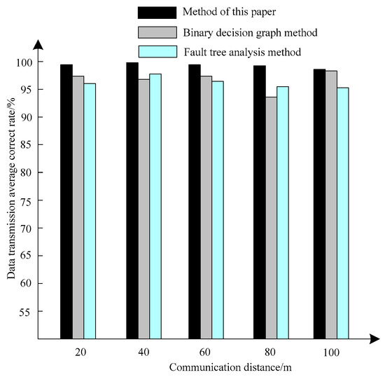The experimental results in Figure 6 show that the average accuracy of data transmission of the information system using this method to maintain the communication failure decision-making is more than 99.5% under different operating distances, while the average accuracy of data transmission of the information systems using the binary decision diagram method and fault tree analysis method is only 98.5% under different operating distances. The experimental results show that the information system using this method to maintain the communication failure has better communication performance.