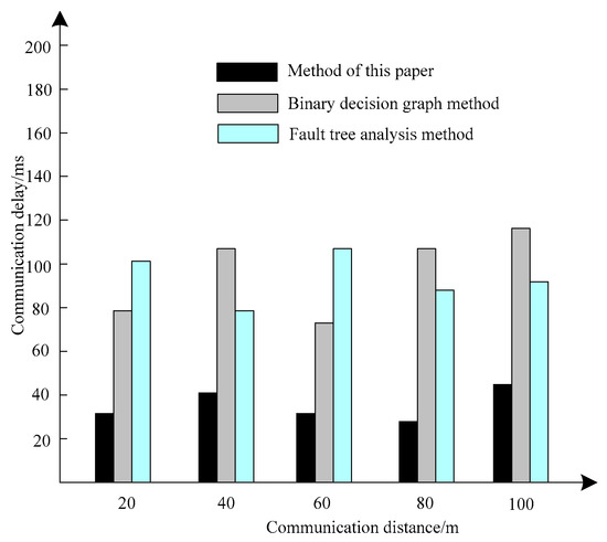 The experimental results in Figure 7 show that the data transmission delay of the information system using this method to maintain the communication failure decision-making is less than 50 ms under different action distances, while the data transmission delay of the information systems using the binary decision diagram method and the fault tree analysis method under different action distances is at least 78 ms and 80 ms, and the data transmission delay is an important index to evaluate the performance of the information system. The results show that the information system using this method to maintain the communication failure decision-making has better data transmission performance.