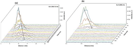 The comparative spatial-temporal evolution of the emission lines corresponding to Ca I atoms (396.15 nm)—(a) and Ca II ions (546 nm)—(b).