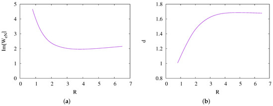 In (a) the dependence of the imaginary component Im[] of the nuclear spin-dependent spatial parity nonconserving (NSD-PNC) e–N matrix element in the units of Hz is represented as function of the internuclear distance R in the units of the Bohr radius (see Equation (17)); (b) depicts the dependence of the transition dipole moment matrix element in (e is the electron charge) on the internuclear distance R in the units of the Bohr radius (see Equation (17)). Both (a) and (b) correspond to the case of mixing between and .