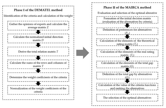 The proposed DEMATEL–MAIRCA model was developed by Serbian researcher Dr. Dragan S. Pamucar [36]. The application of the MCDM model is a hybrid of two techniques. The fuzzy DEMATEL model collects knowledge to capture the causal relationships between strategic criteria [37,38]. The model is especially practical and useful for visualizing the structure of complicated causal relationships with matrices or digraphs [39,40]. In other words, this method would identify the causal relationship among the selected criteria. The multiattribute ideal–real comparative analysis (MAIRCA) compares both theoretical and empirical alternative ratings [41], evaluates the alternatives, and selects precandidate cities for allocating CILC. The phases of the DEMATEL-MAIRCA method are presented in Figure 1.