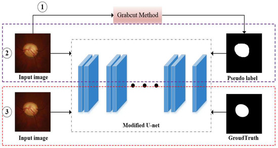 However, most of the current weakly supervised segmentation algorithms and semi-supervised segmentation methods are about the traditional image, and there are few methods about the medical image, especially the optic disc. Therefore, in this paper, we propose a weakly supervised and semi-supervised semantic segmentation algorithm for retinal optic disc images. First, we use the grabcut method as a baseline method to generate pseudo groundtruths, which only use bounding-box level labels as input. Then, we utilize the pseudo groundtruths as groundtruths to train the new model based on a modified U-net. Finally, a little groundtruths are used to fine-tune the model that has been trained in previous step. The experimental results on RIM-ONE and DRISHTI-GS databases prove the effectiveness and superiority of our algorithm. The overview of the proposed general framework has been shown in Figure 2.