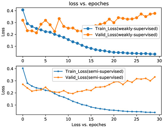 In order to prove the effectiveness of our weakly- and semi-supervised segmentation method, we carried out a verification experiment on the database RIM-ONE and DRISHTI-GS. In this paper, we only randomly selected 10% groundtruths from the training set to implement our semi-supervised method. The Linux operating system version used in this paper is Ubuntu 16.04. We perform all of our experiments on an NVIDIA GTX TITAN Xp GPU (memory Clock Rate (GHz) 1.582) with 48 GB of memory, and the implementation is based on the Keras framework with Python 3.6 programming language. Figure 6 and Figure 7 show the partial segmentation results of the proposed algorithm. From Figure 6 and Figure 7, we can see that our weakly supervised and semi-supervised optic disc segmentation algorithm can segment the contour of the optic disc image very well. Although without groundtruth training (the proposed weakly supervised method) or just using a few groundtruths to train (the proposed semi-supervised method), the proposed method can still segment the optic disc accurately, and the result is very close to that of groundtruth. At the same time, we describe the changes of loss in the training stage of the two methods in Figure 8 and Figure 9.