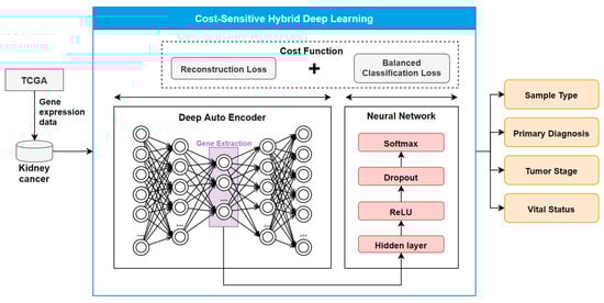 In the experiments, the extracted target genes were subject to classification analysis, and the performance was evaluated. Figure 1 shows the proposed COST-HDL approach which input the gene expression data of kidney cancer from the TCGA portal and output four kinds of prognoses namely, sample type, primary diagnosis, tumor stage, and vital status. It consists of a hybrid of DAE and NN models. For the RNA sequencing data, the number of variables is significantly higher than the number of samples. Therefore, general classification analysis is prohibited by technical challenges in dealing with more than 60,000 variables: it is challenging to apply the data mining and machine learning algorithms to the raw dataset. Therefore, in this study, we used the 5-layer DAE model (the first 2 layers for encoding, the middle layer for gene extraction, and the last 2 layers for decoding) to extract significant genes and extract deep features from gene biomarkers as a result. The extracted deep features were input to the NN classification method (hidden layer + dropout [] + Rectified Linear Unit (ReLU) [] + softmax []).
