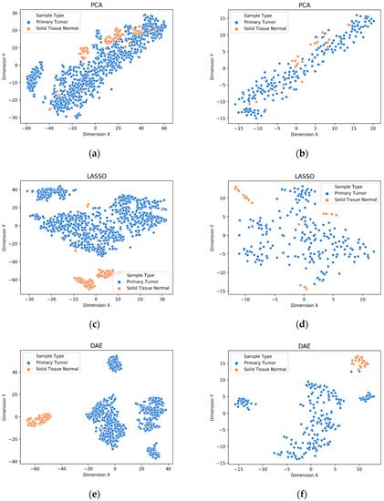 Visualization of extracted features from gene biomarkers for sample type prognosis: (a) train data extracted by PCA, (b) test data extracted by PCA, (c) train data extracted by LASSO, (d) test data extracted by LASSO, (e) train data extracted by DAE, (f) test data extracted by DAE.